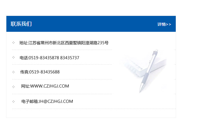 地址:常州市新北區友邦商務大廈1幢16、17層  電話:0519-85101652  傳真:0519-85112595  郵編:213022  網址:www.cz-jiayue_cn.iceblade-outward.com  郵箱:xiajifengaa@163.com